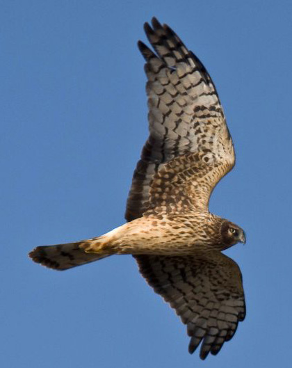 Harriers show a greater difference between male and female plumage than typical of raptors. Females, brown above with varying degrees of brown and buff streaking below contrast with males, gray above with an unmarked lighter color below. Few raptors share this sexual dimorphism. Juveniles are brown above and plain orange-brown below. The northern harrier wing span of about 4 feet enables it to fly at 24 to 38 mph low over the ground at about 10-30 feet in a pattern of a few beats followed by a short glide, wings held slightly up in a V shape. It drops quickly to its prey.